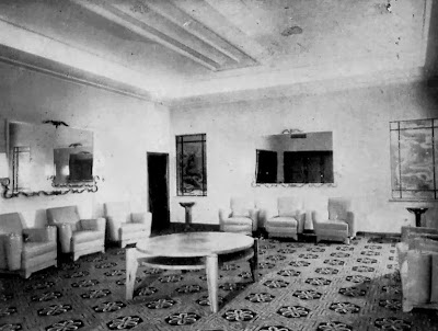 A decoração do "Marrocos", que esteve a cargo de Jacques Monet e Nizet, revestiu de uma personalidade senhoril e de grande distinção o "hall" de entrada, guarnecido por imponentes espelhos, onde artísticos desenhos irão apresentando os cartazes dos filmes em exibição e por estrear. A mesma guarnição de espelhos reveste o salão de espera, enquanto no átrio, juntamente com a fonte luminosa, encontramos um painel em alto relevo, contando em termos incisivos a história do cinema em suas diversas fases. Os desenhos do piso, de originalidade e concepção extraordinariamente delicadas, são apresentados em bronze e repetidos na mesma disposição, na decoração do teto e nas artísticas cantoneiras dispostas sob os espelhos.